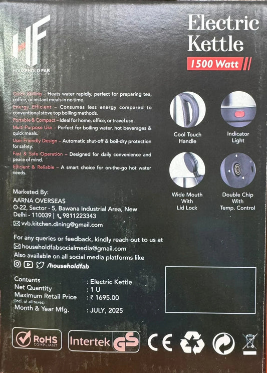20% OFFBrand New A brand new product is an unused, unopened, and undamaged item, complete with its original packaging, accessories, and manufacturer's warranty, having never been previously sold or used.HF HOUSEHOLD FAB From Instant Meals to Midnight Teas; We've Got You Covered. Electric Kettle 1500 Watt, 1.8 L (Silver)