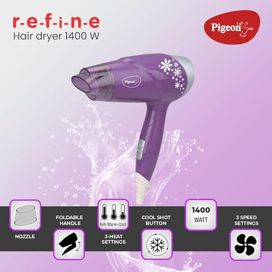OPEN BOX An open-box product is a brand new, unused item that has been opened, but remains in excellent condition with full functionality & warranty.Pigeon Hair Dryer| 1400 Watts| 3 Speed & Temperature With Cool Shot (Hot/Cool/Warm)| Foldable Handle| For Women and Men| 2 Years Warranty| Purple