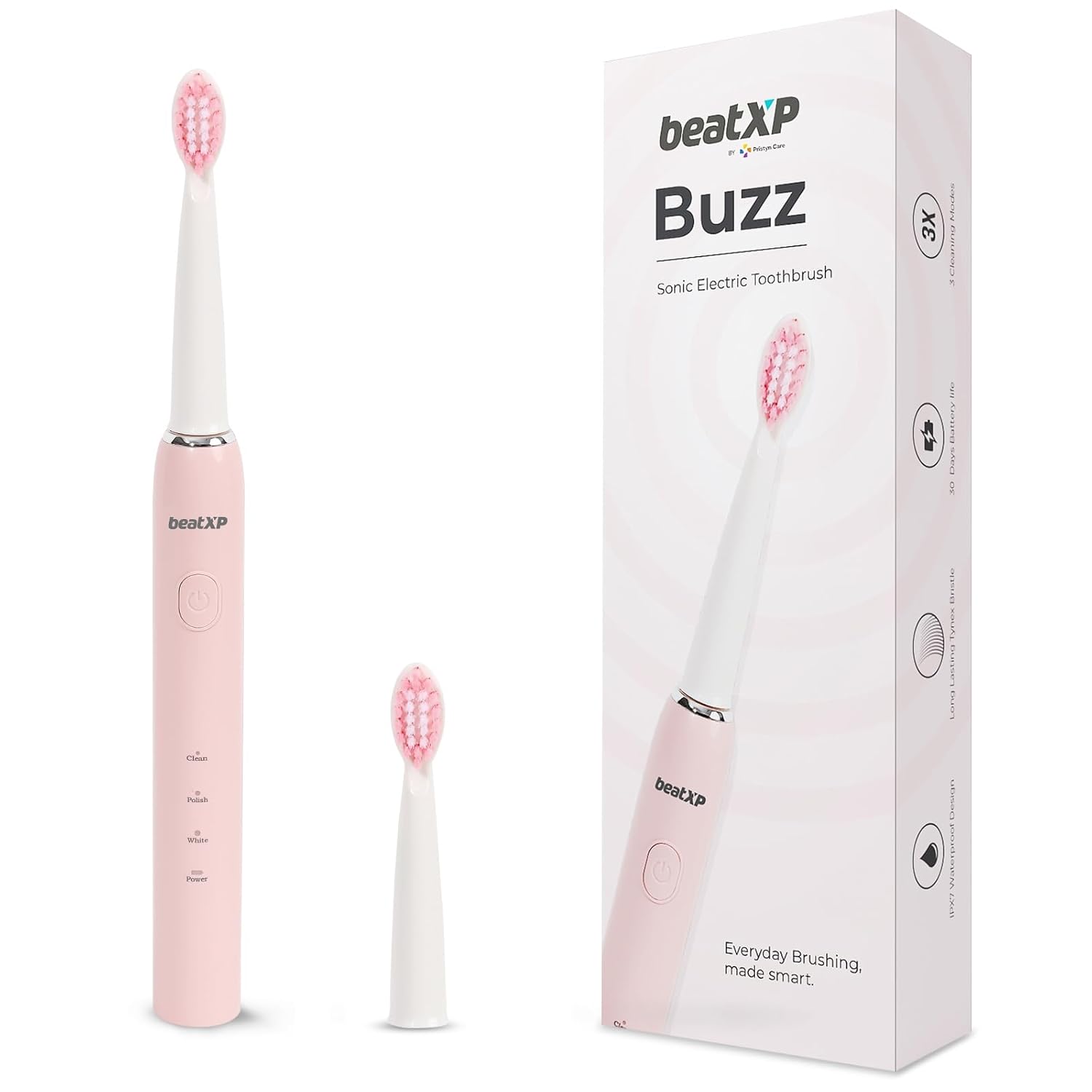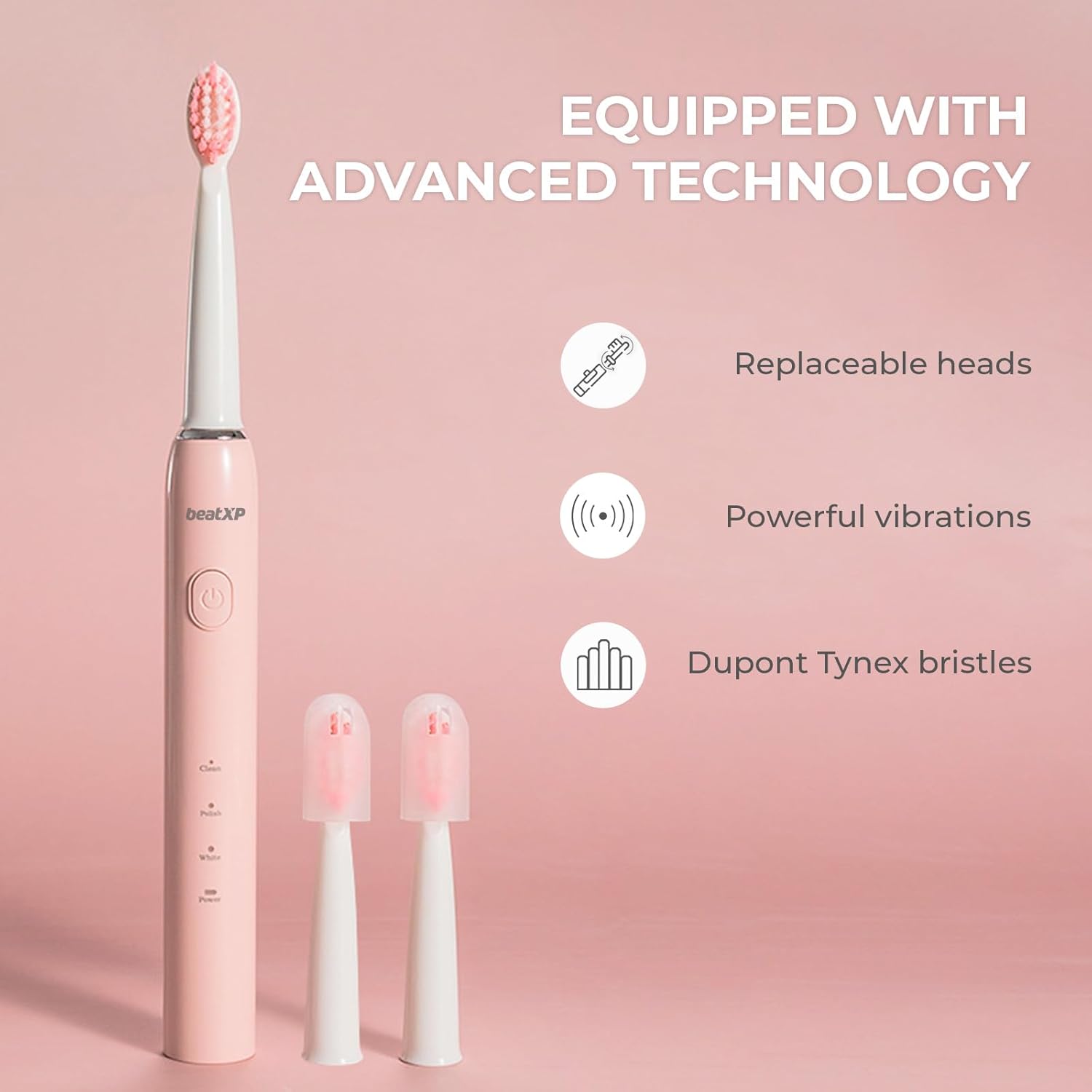 beatXP Buzz Electric Toothbrush for Adults with 2 Brush Heads & 3 Cleaning Modes|Rechargeable Electric Toothbrush with 2 Minute Timer & Quadpacer|19000 Strokes/min with Long Battery Life (Pink)