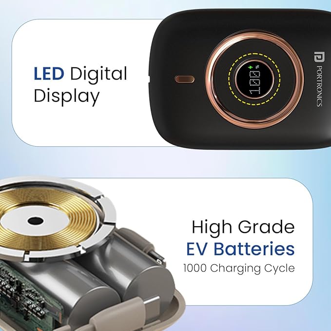 Portronics Power Shutter Pro 35W 10000mAh SuperFast Charging Wired Powerbank with in-Built Type C PD Cable, Type C Input/Output Cable,LED Display,EV Grade Batteries,Support with Android, Apple,Tablet
