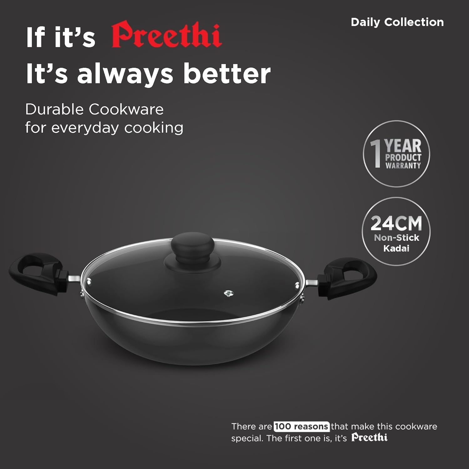 Preethi Daily Collection Non Stick Kadai 24 cm, with Glass Lid, 5 Star Non Stick Effect, Grey