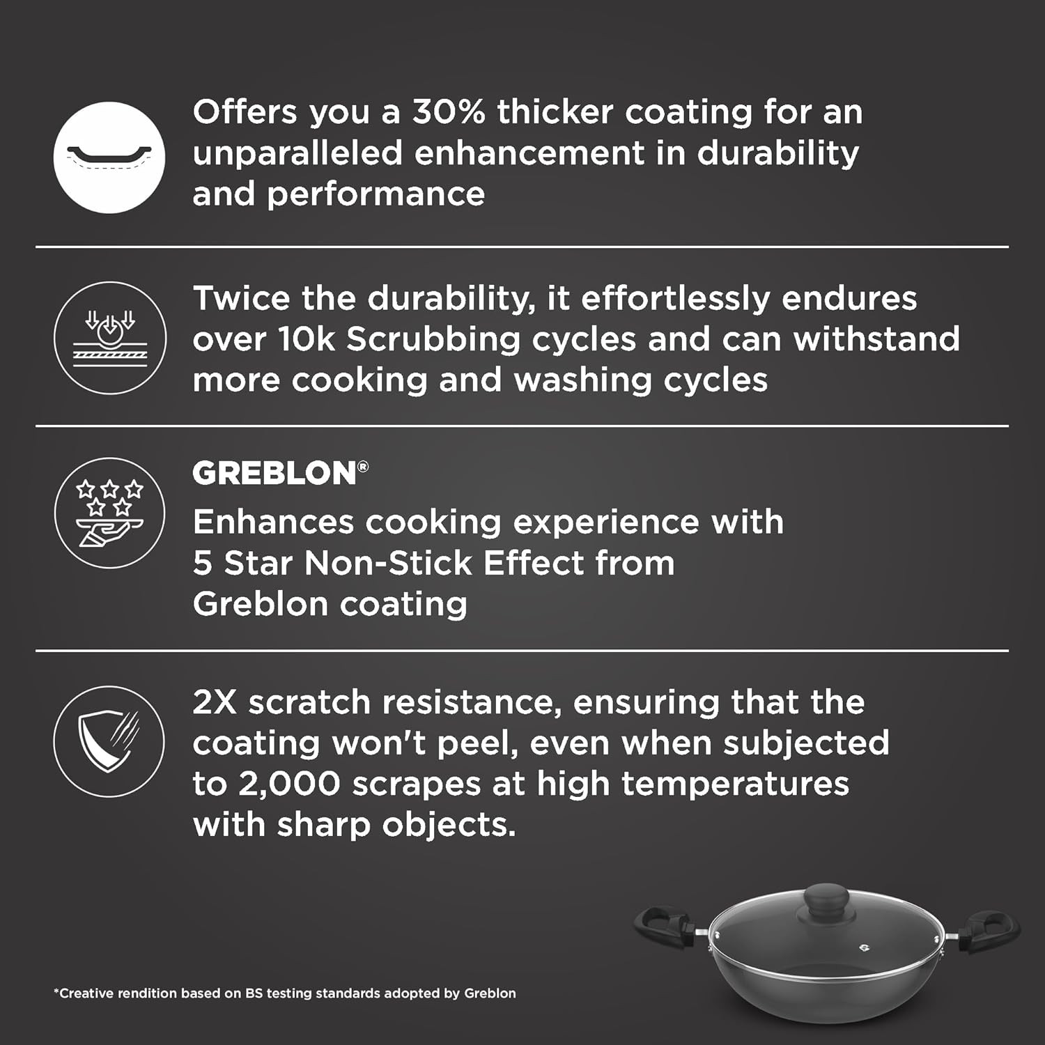 - 2X scratch resistance, ensuring that the coating won't peel, even when subjected to 2,000 scrapes at high temperatures with sharp objects.